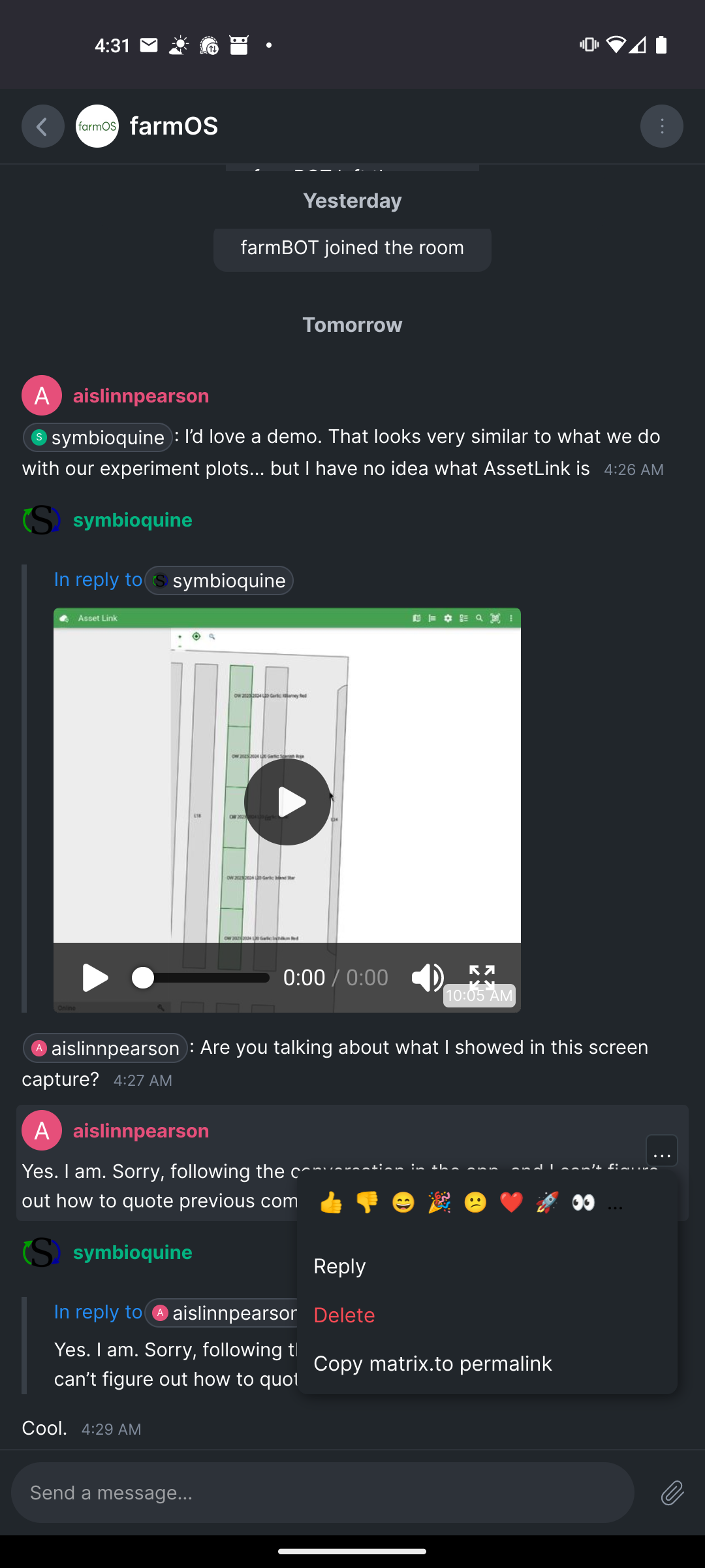 | [07:28:51] | <aislinnpearson[m]> | Yes. I am. Sorry, following the conversation in the app, and I can’t figure out how to quote previous comments |