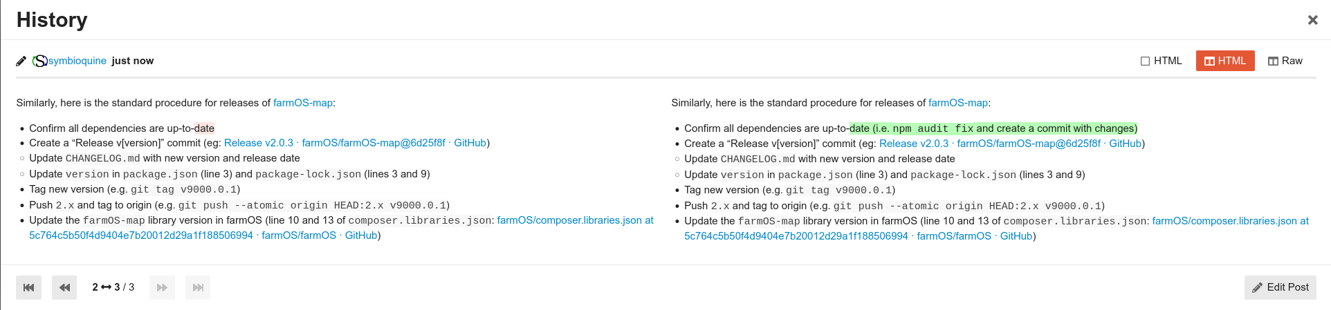 | [10:57:40] | <symbioquine[m]> | * I released farmOS-map 2.3.0, but in the process noticed that the [release procedures](https://farmos.discourse.group/t/3-x-release-procedure/1070/4) aren't clear about whether we mean just running `npm audit fix` or something more thorough to "Confirm all dependencies are up-to-date" |